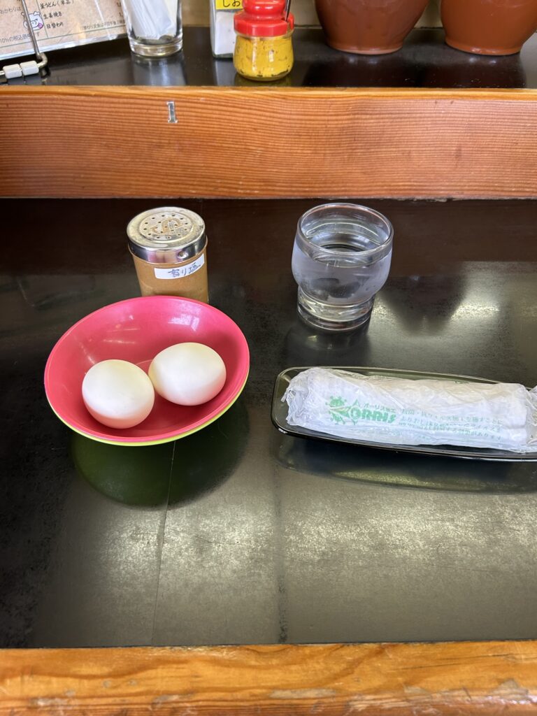タレかつ丼が出来上がるまでの間はゆで卵タイムです。上手に殻が剥けると気分良くなりますね。