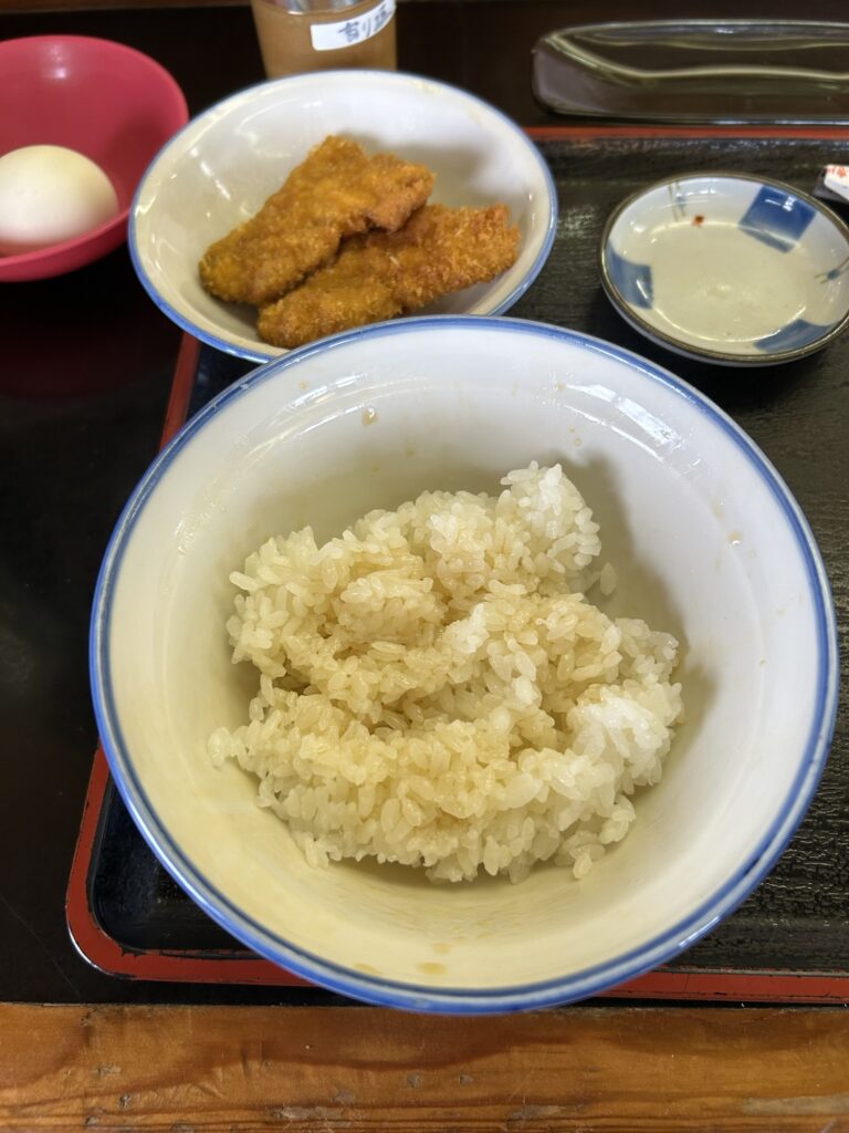 最初の一杯をタレかつ3枚でやっつけて、ライスのおかわりです。「ライスのおかわりで、1/3でお願いします。」とオーダーです。おかわりすると割と沢山持ってくれます。1/3でもこの量なので参考にしてください。(もしかしたら盛る店員さんに寄るかもですが)