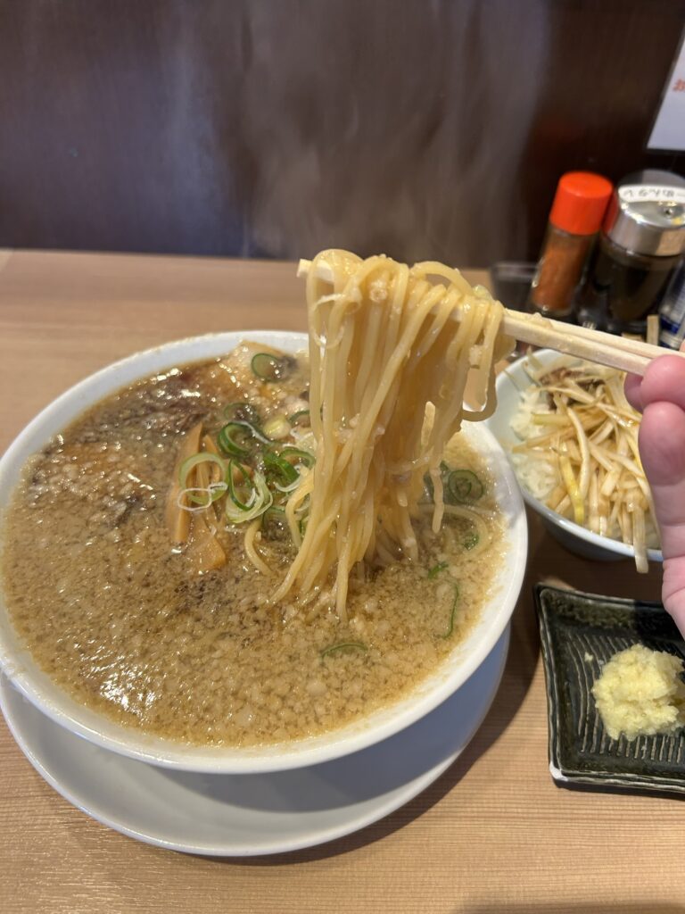 背脂醤油だから太麺なのかと思いきや、生姜醤油と同じなのかな。ストレートの中太麺ですね。