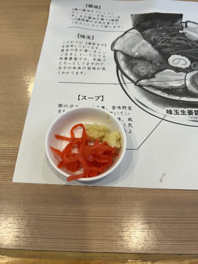 生姜はスープに溶け込んでいなくて、具材のように載っていました。追い生姜を入れる前にスープに載った生姜を先に溶いてすすってみましたが、豚骨の風味に負けているのかあまり生姜感は感じませんでした。