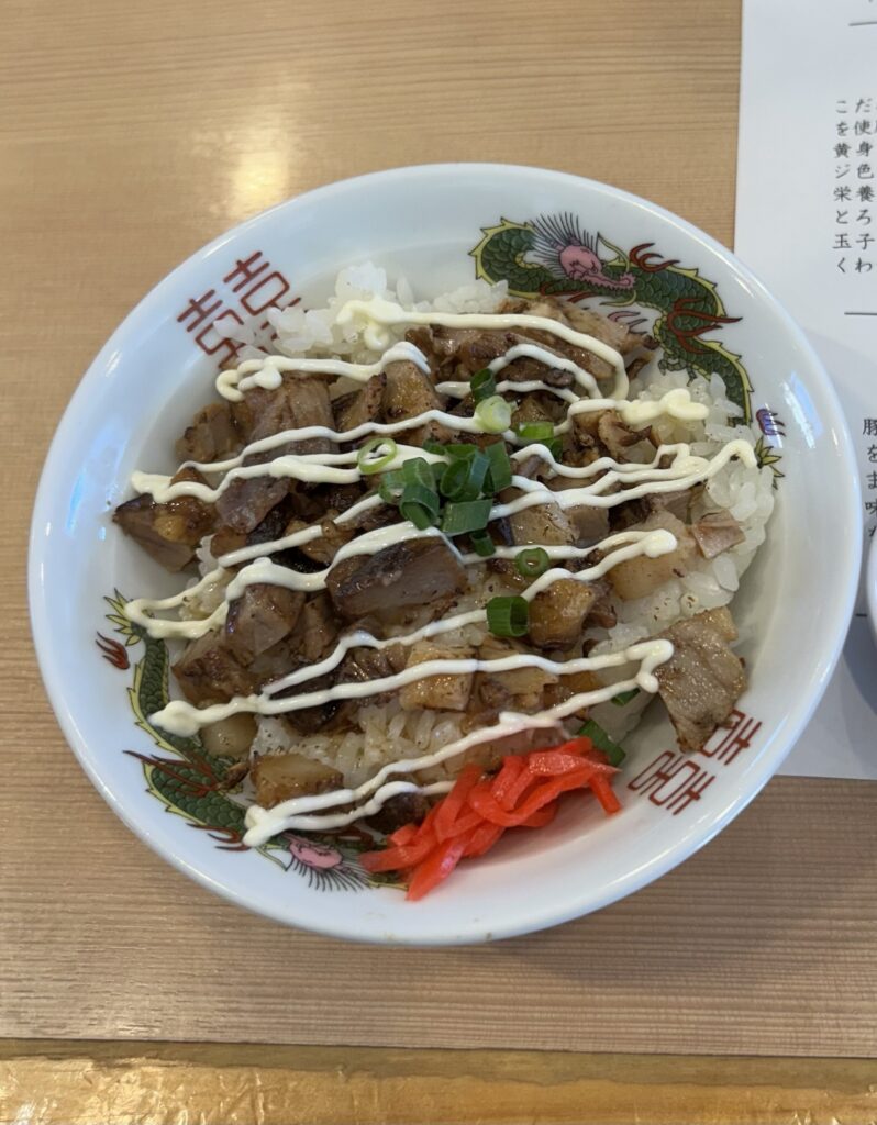 細切れのチャーシューは炙られてたので、風味がありました。マヨネーズだけでなく甘めのタレが掛かっていて、甘めのタレがライスにも染み込んでいてご飯がすすむ君でした。