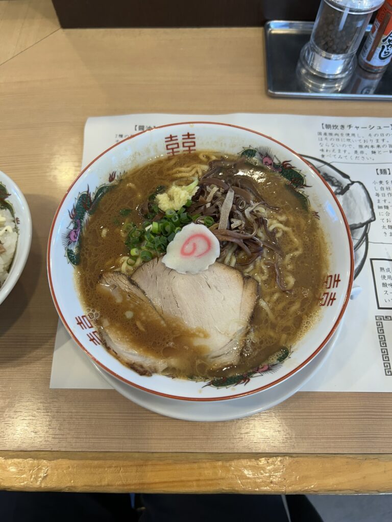 豚骨というと博多の方の白いスープのイメージがありますが、豚骨醤油でした。豚骨の風味もあって味は濃い目のしょっぱ目です。ライスが食べたくなるくらい濃い目なので、セットでの注文がおすすめです。